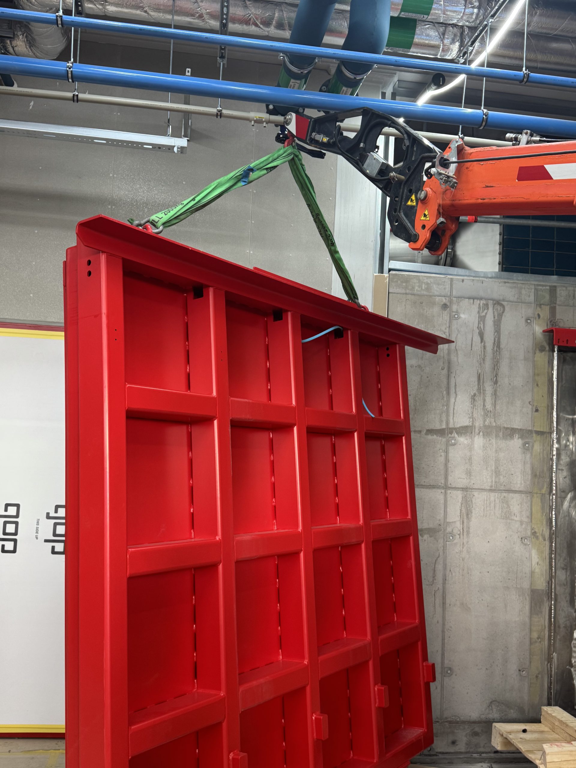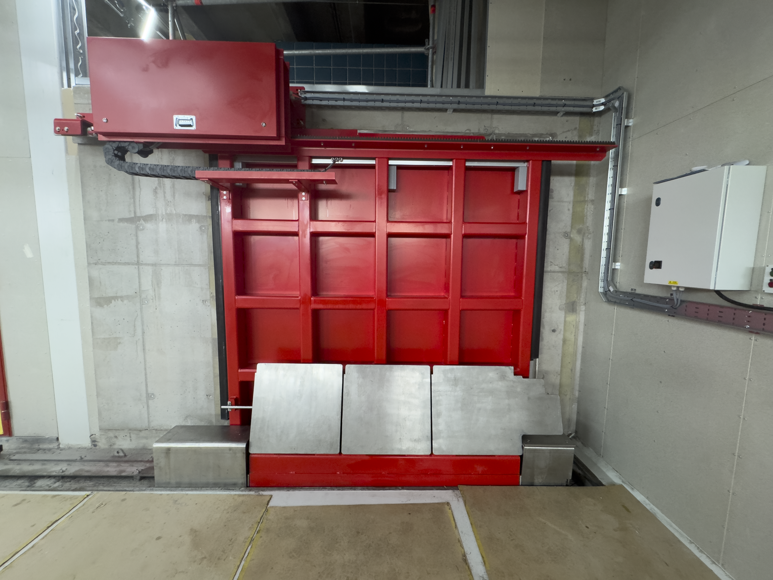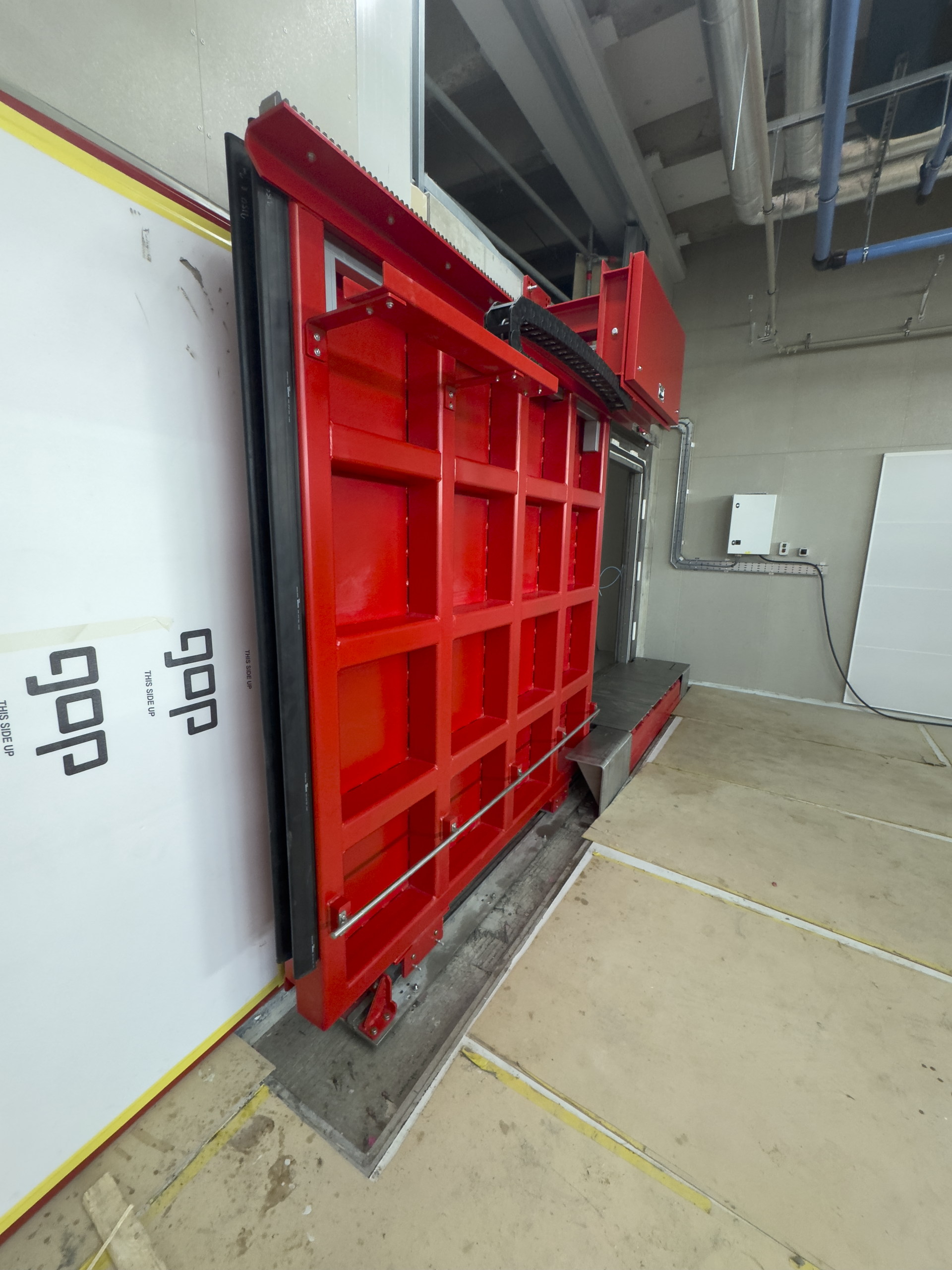 The restricted space within the facility required careful planning and specialised equipment. We utilised a spider crane, which allowed us to minimise floor loading while safely managing the door leaf installation despite the chamber’s restricted headroom.